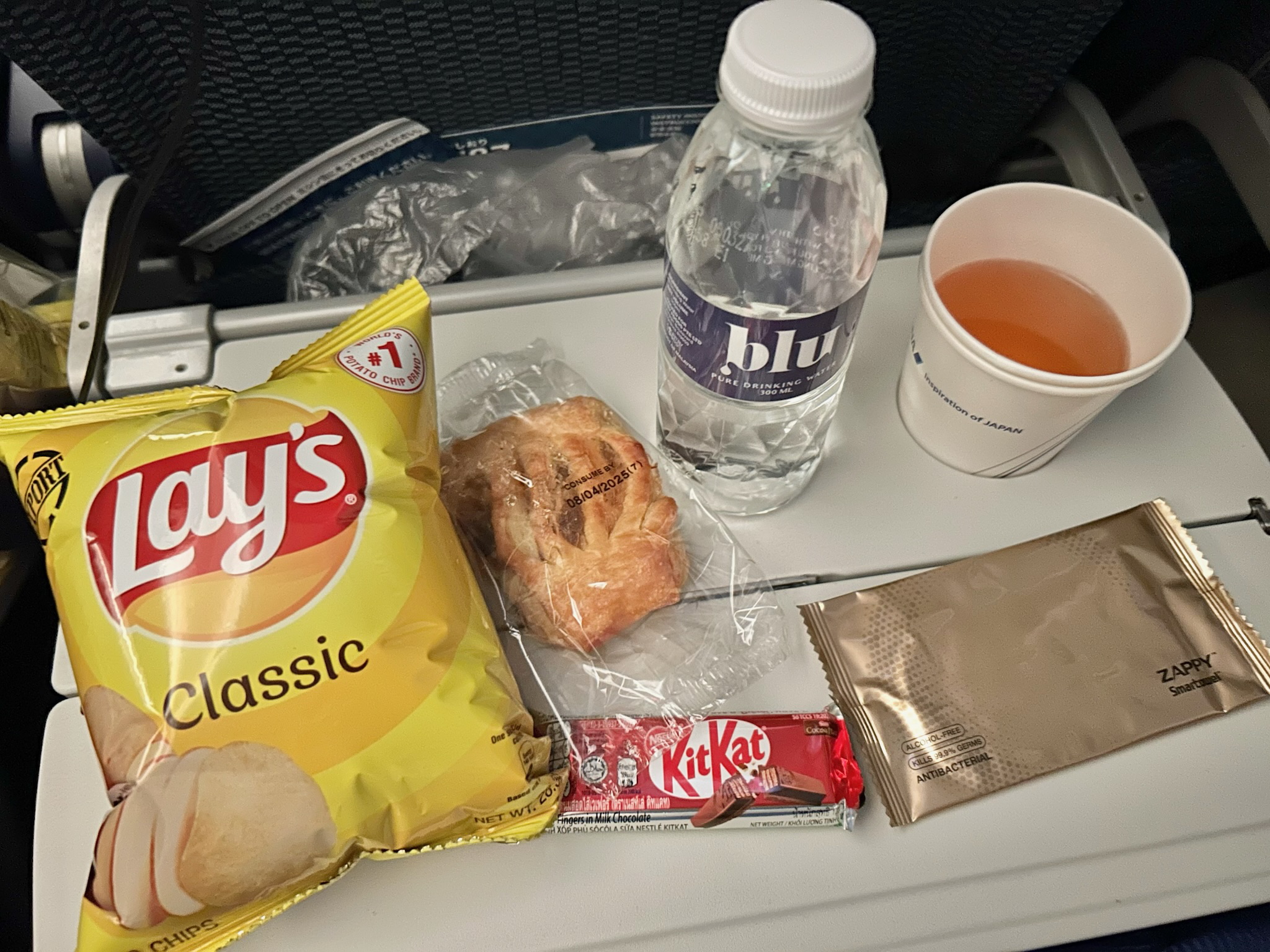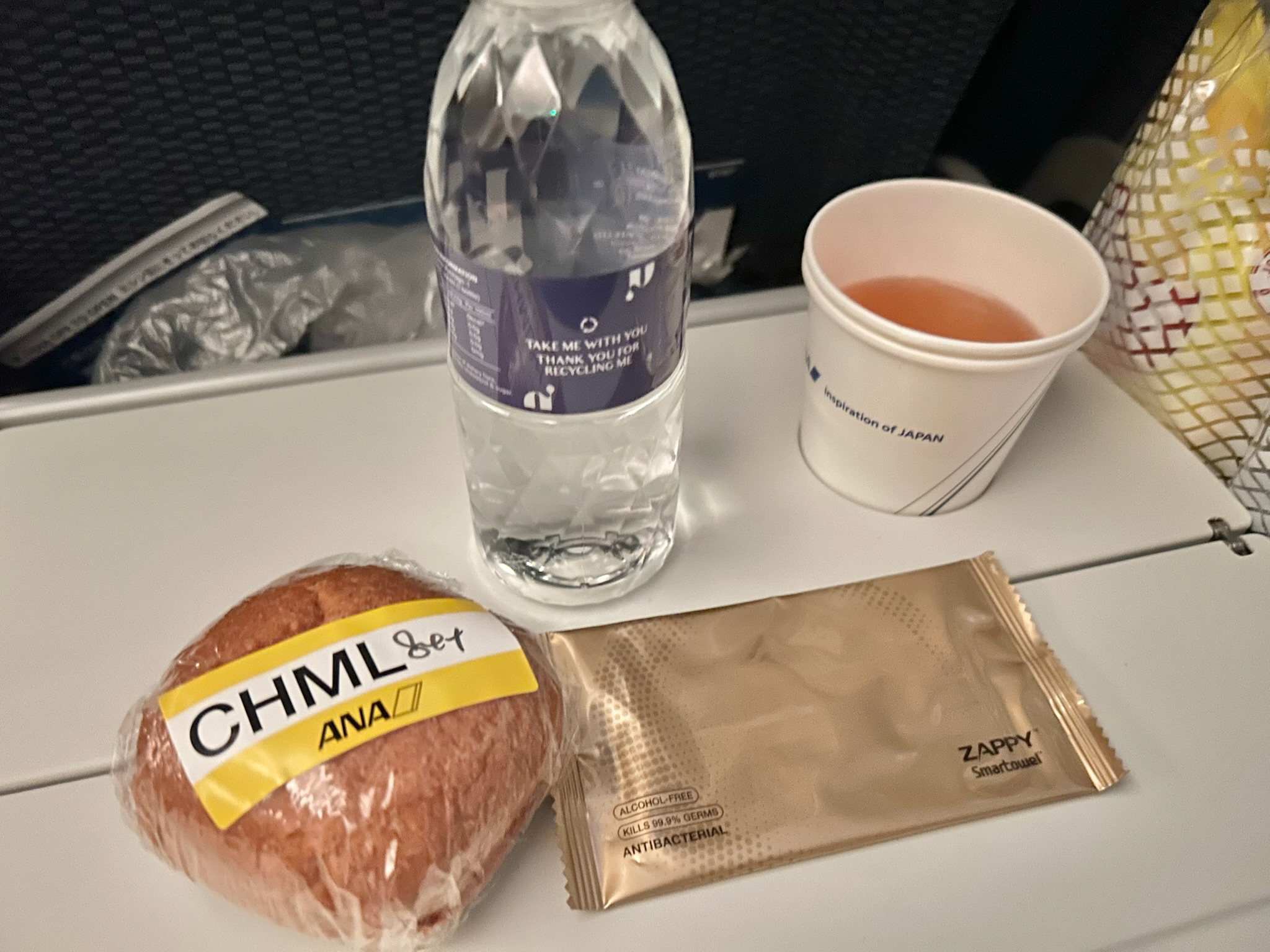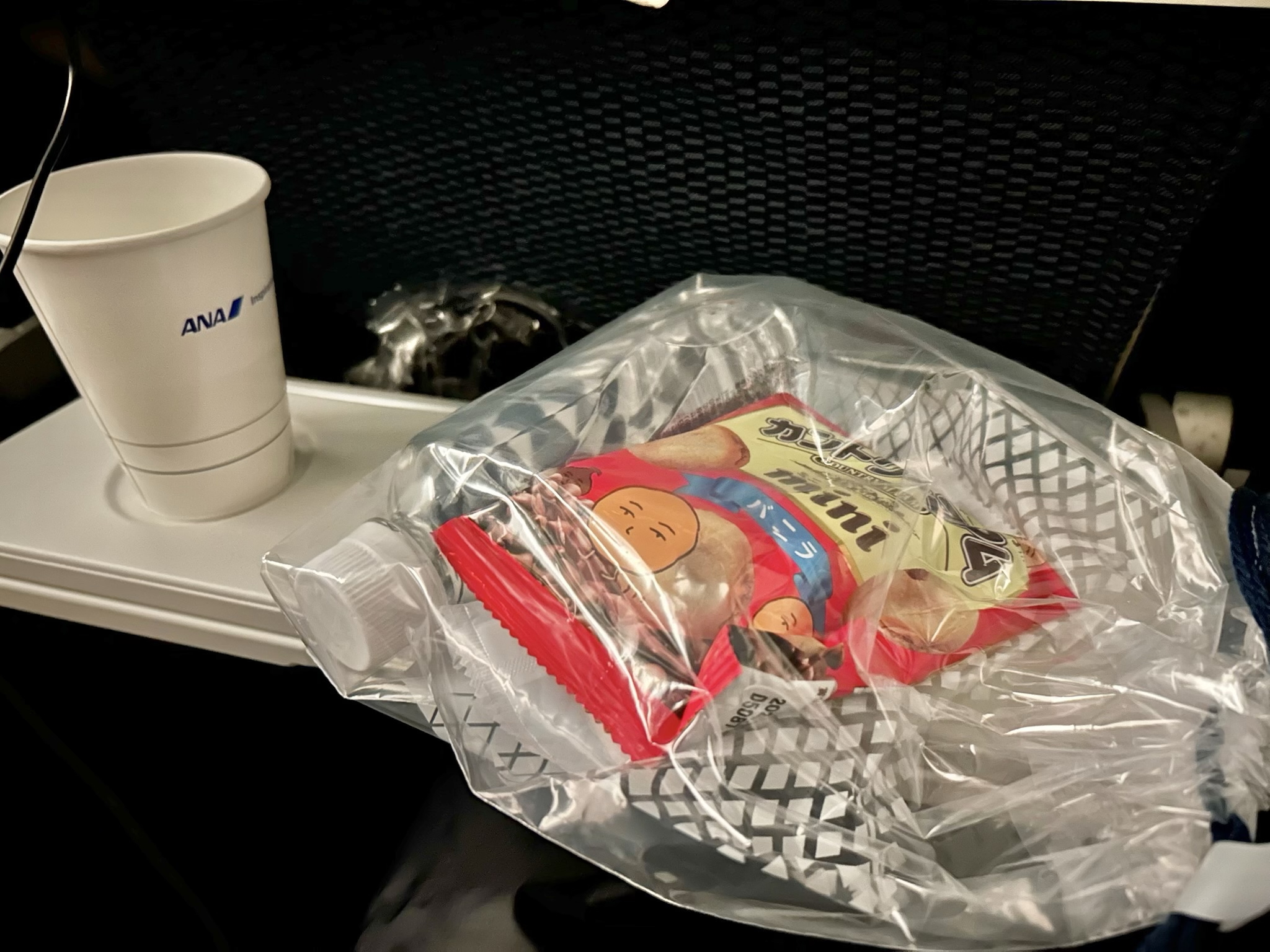 気流の影響で機内食の提供が少し遅くなったようですが、軽食とドリンクをいただきました。この時間に食べることがなかなかないので、ここでは食べず…