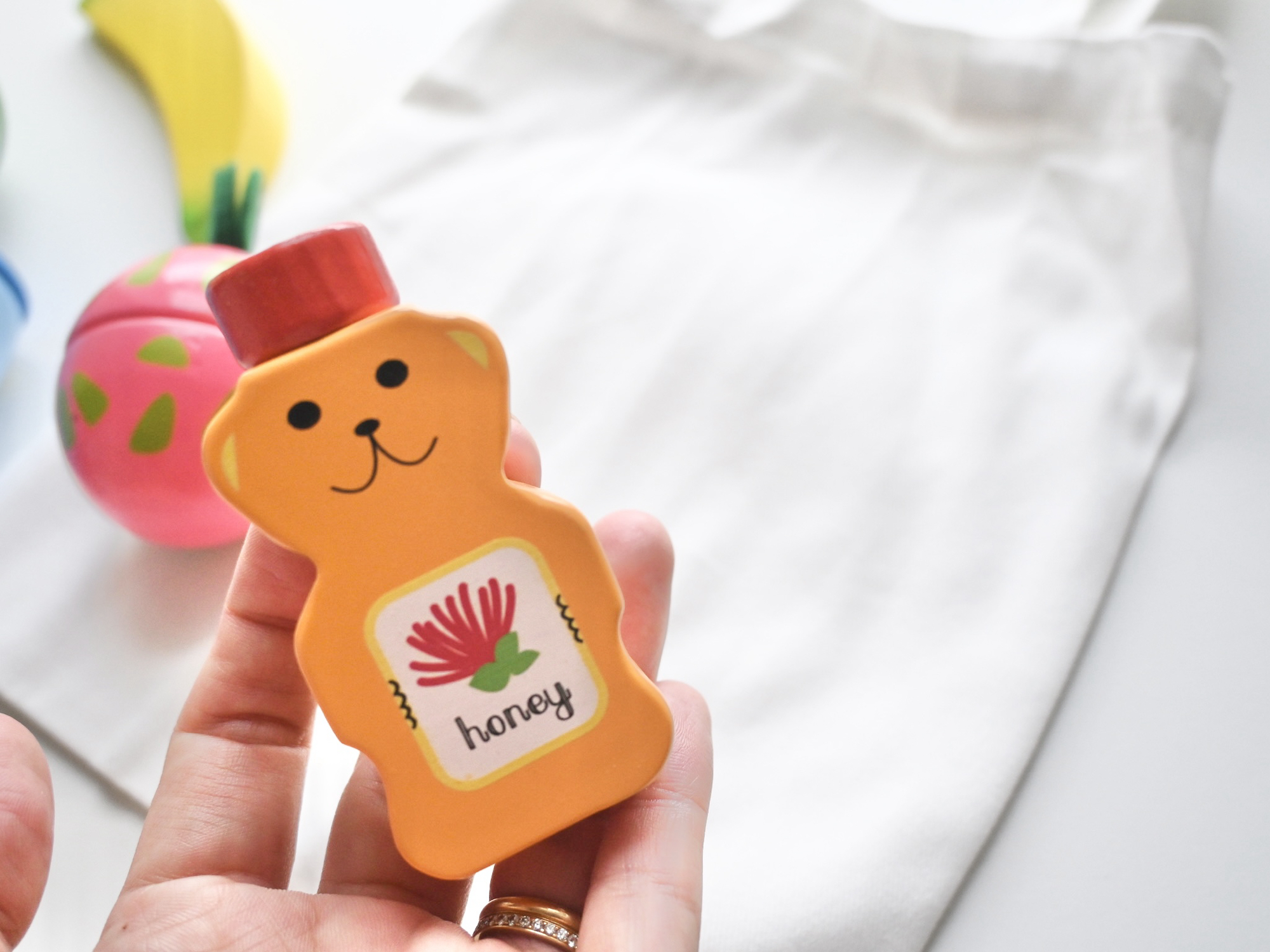 ファーマーズマーケットに売っている有名なクマのハチミツやマカダミアナッツなど、ポップでかわいい木製のおもちゃです!中にはバッグも入っているので、おままごとでお買い物気分も味わえちゃいます